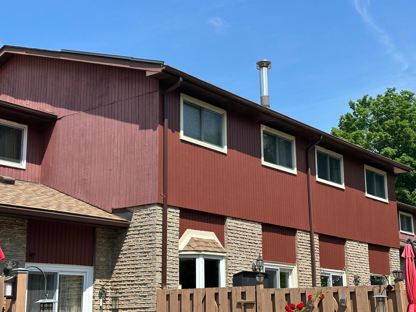 Completed a full exterior repaint of a two-story townhouse, refreshing the façade with a durable, weather-resistant finish. The project included surface preparation, priming, and precise application of rich red siding paint with contrasting beige window trims. The result is a vibrant, long-lasting look that enhances curb appeal while protecting the structure from the elements.